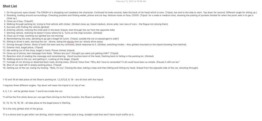 I spent the night brooding on this and thinking of how to improve the story I was telling while also adding new elements and not making mistakes. A number of firsts came out of this process, like making a shot list and mounting my gimbal onto a tripod for shots in my car and I am pleased with the results.