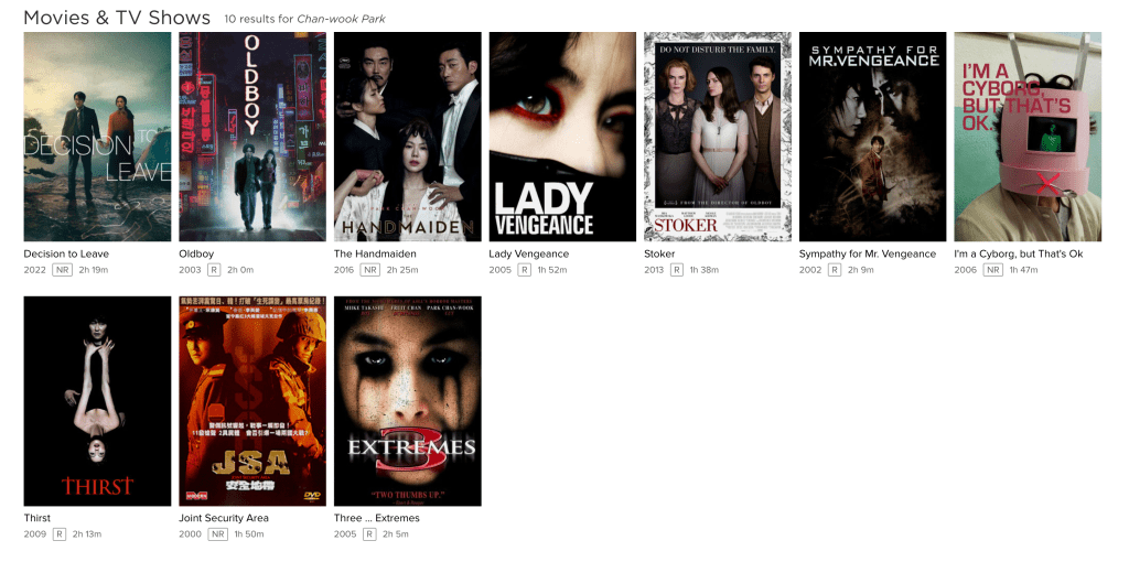 So, I’ve driven that point into the ground. It’s true for many other filmmakers as well. Yet, if we look at the catalogue for Mr. Park on Netflix DVD we see: