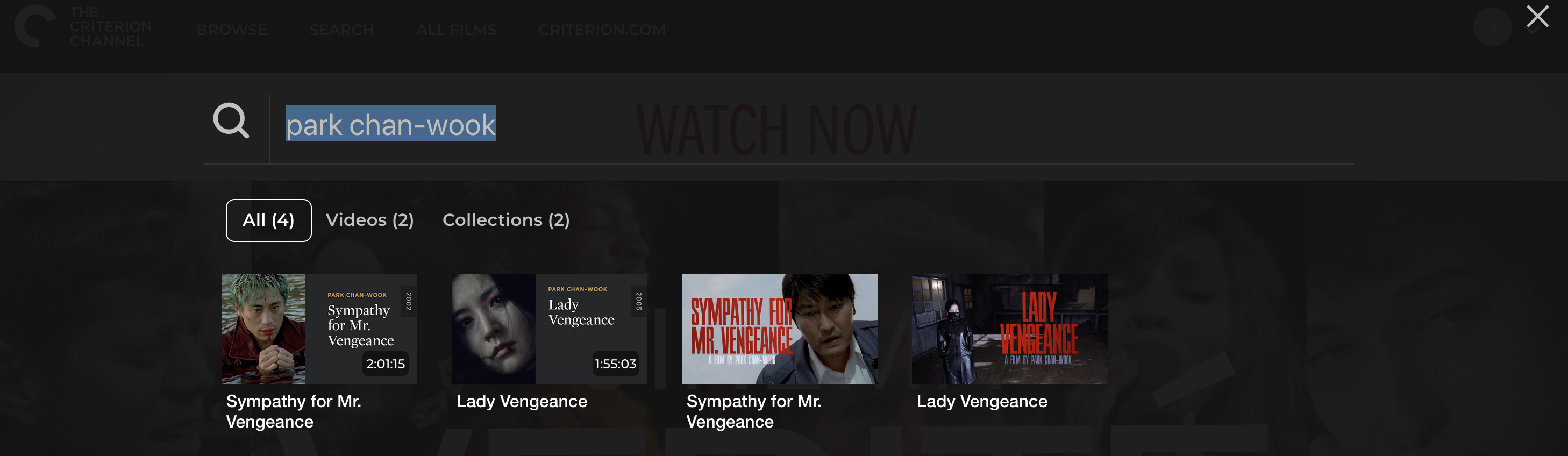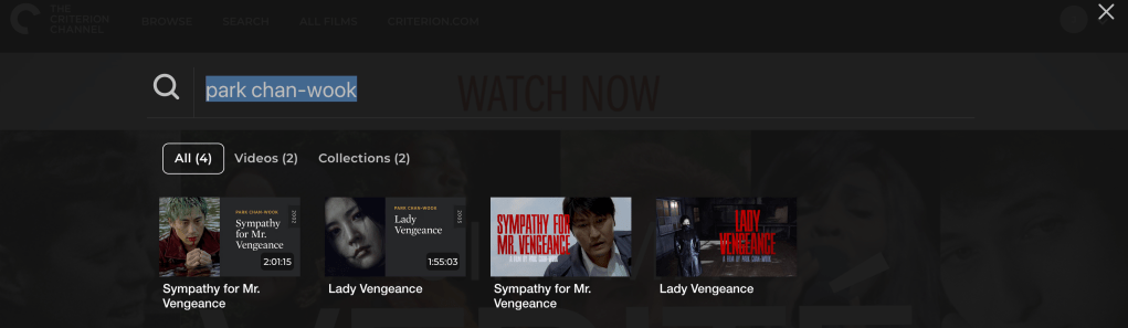 Clicking on the Search menu brings up a search bar. Using this leads to interesting results. This morning I was curious which films they had from the director Park Chan-wook. When I searched using the app on my television I had quite a few results, many having nothing directly to do with the director. Searching on the website I get these results –