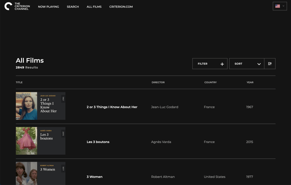 So the site is incorrectly formatted (at least for Firefox and Safari). There are four menus at the top which are unhelpful. You can Browse, Search go to All Films or, bizarrely leave this site to visit Criterion.com. Now as someone who likes language and uses many streaming services (listed in no particular order here: Netflix, Amazon, The Criterion Channel, Mubi, Hulu, Disney+, The Roku Channel, Plex TV, Kanopy, Hoopla, HBO Max, PBS and Apple TV) I cannot say with confidence what the difference between the Search menu and the Browse menu are. Let’s find out.