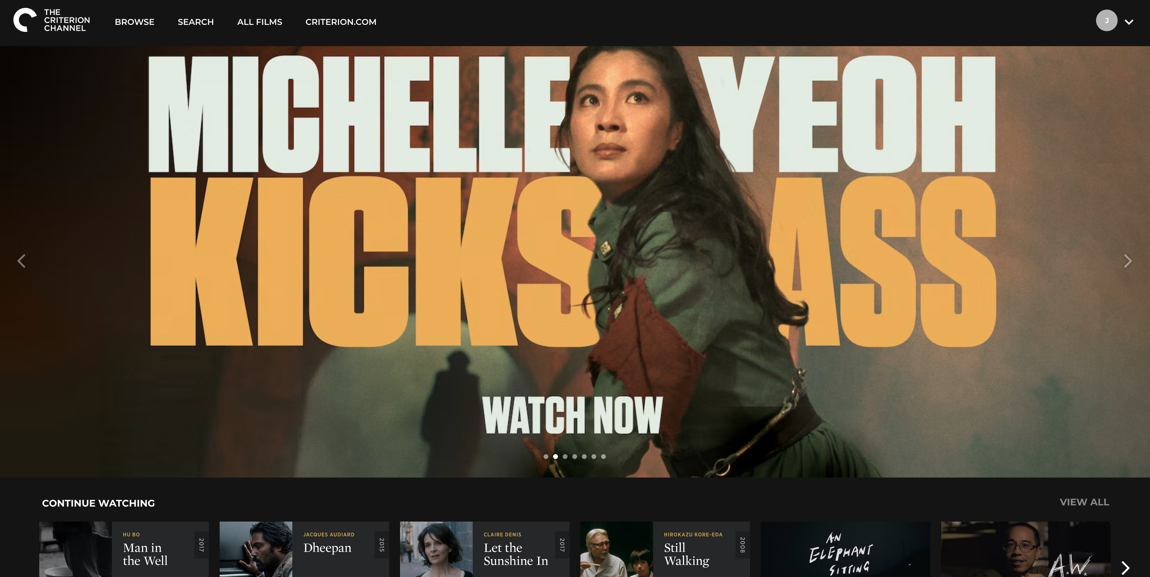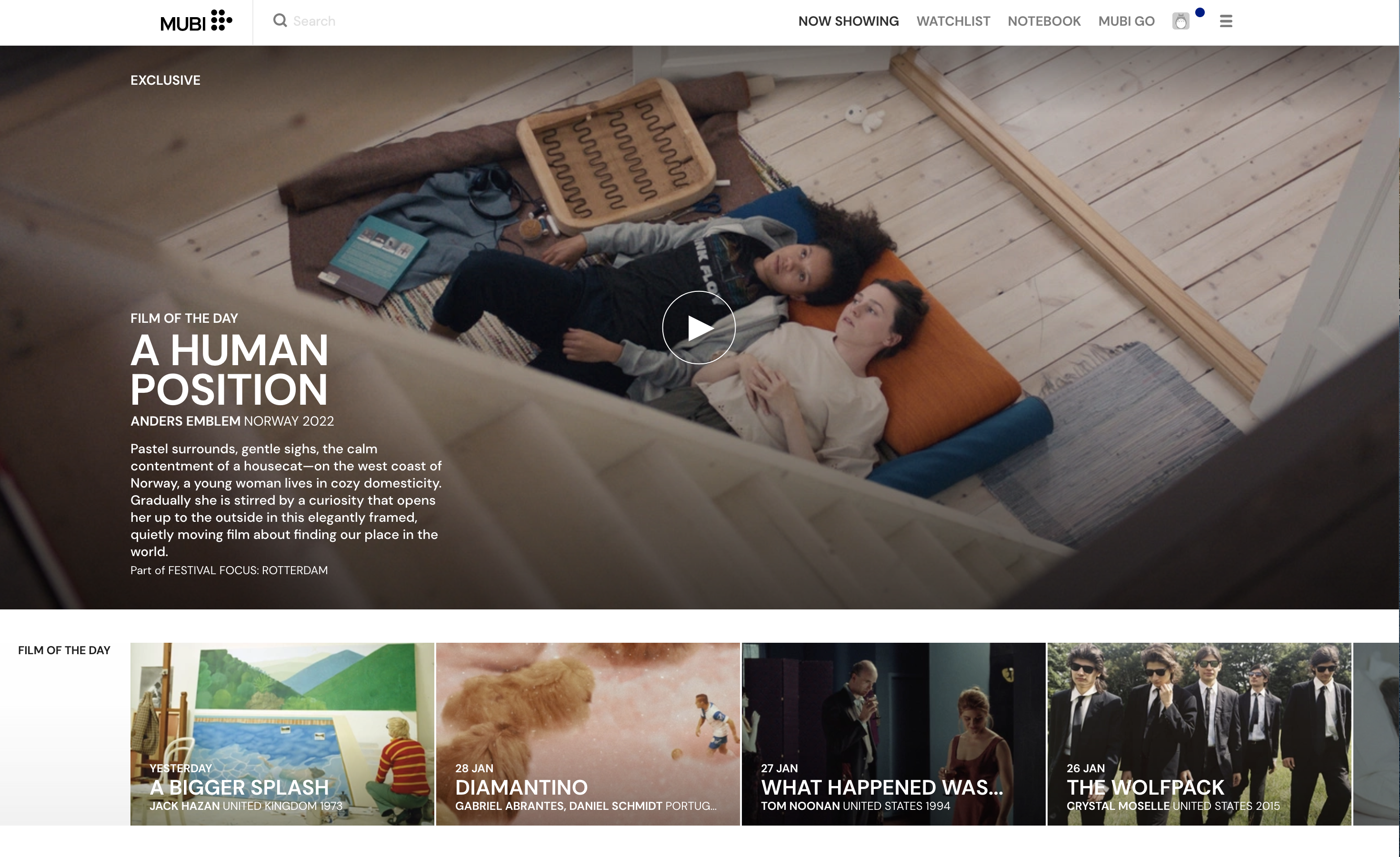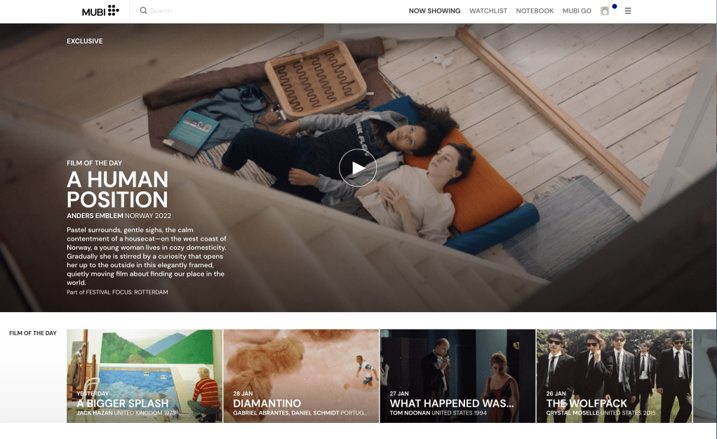 I love that the search bar is built into the top of the screen and they highlight the current tab I am using. The tab next to Now Showing is their Watchlist (List) which is great to have available at the top of the screen. Their version of Criterion.com (minus the selling of DVDs and Blu-rays) is Notebook which has plenty of great written content for those of us who also like to read about film. Mubi Go, which is a separate membership, is their weekly service that allows you to go and see a film in theaters. Your account icon is by default Totoro (points for this) and then a drop down menu with numerous other options.