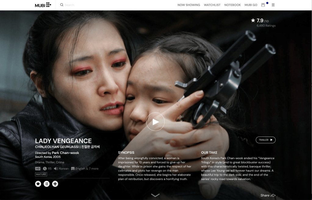 Among the things I think Mubi does better (or I appreciate) – they offer the title of the film in its original language. Both sites are in English because that’s what I speak, but this feels respectful. I also like that in addition to the synopsis they have the “Our Take” for films. I have found that I no longer bother reading the synopsis because I want to hear what this person has to say about this film. This is the personal, human touch I long for when it comes to film recommendations.