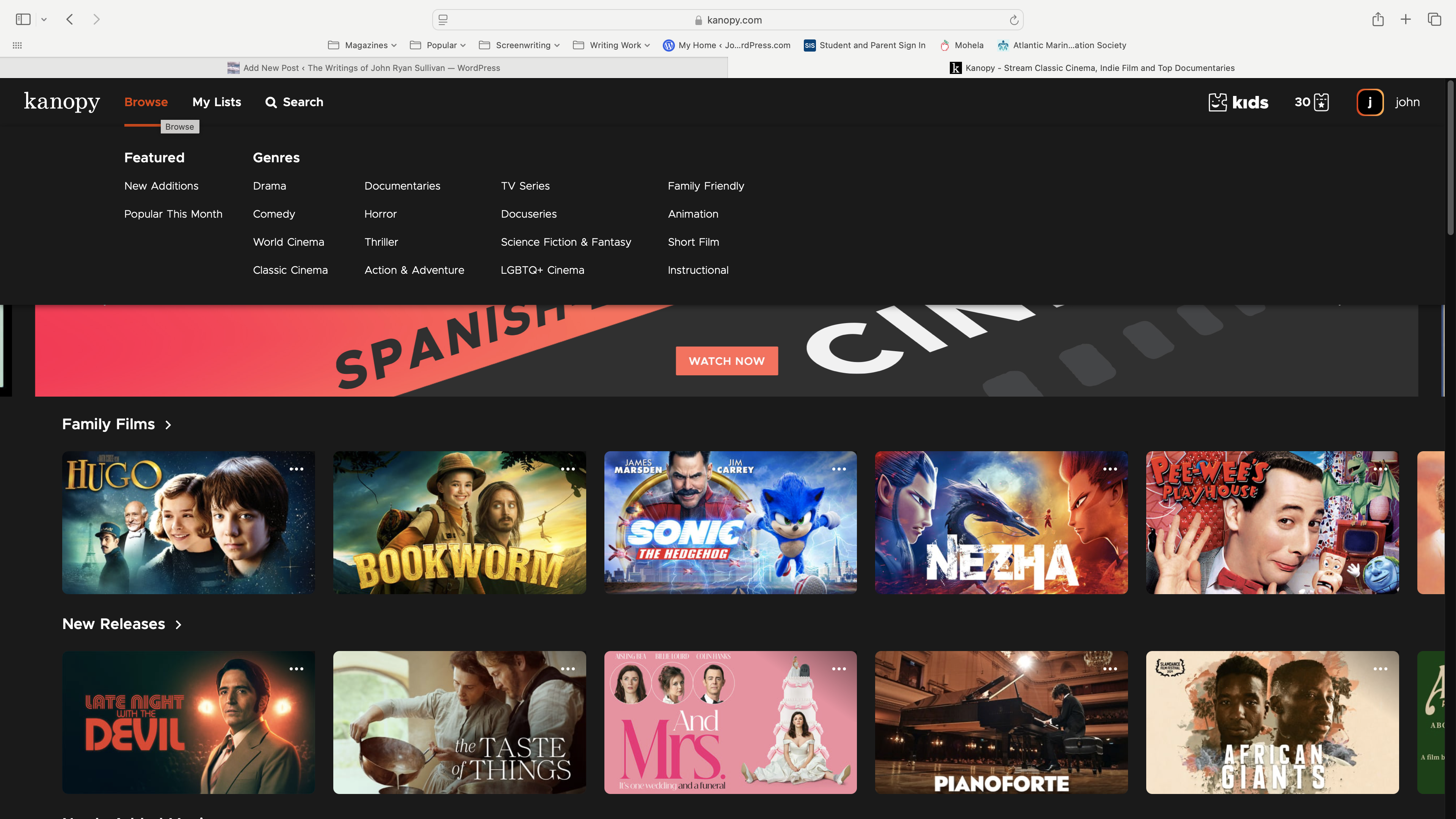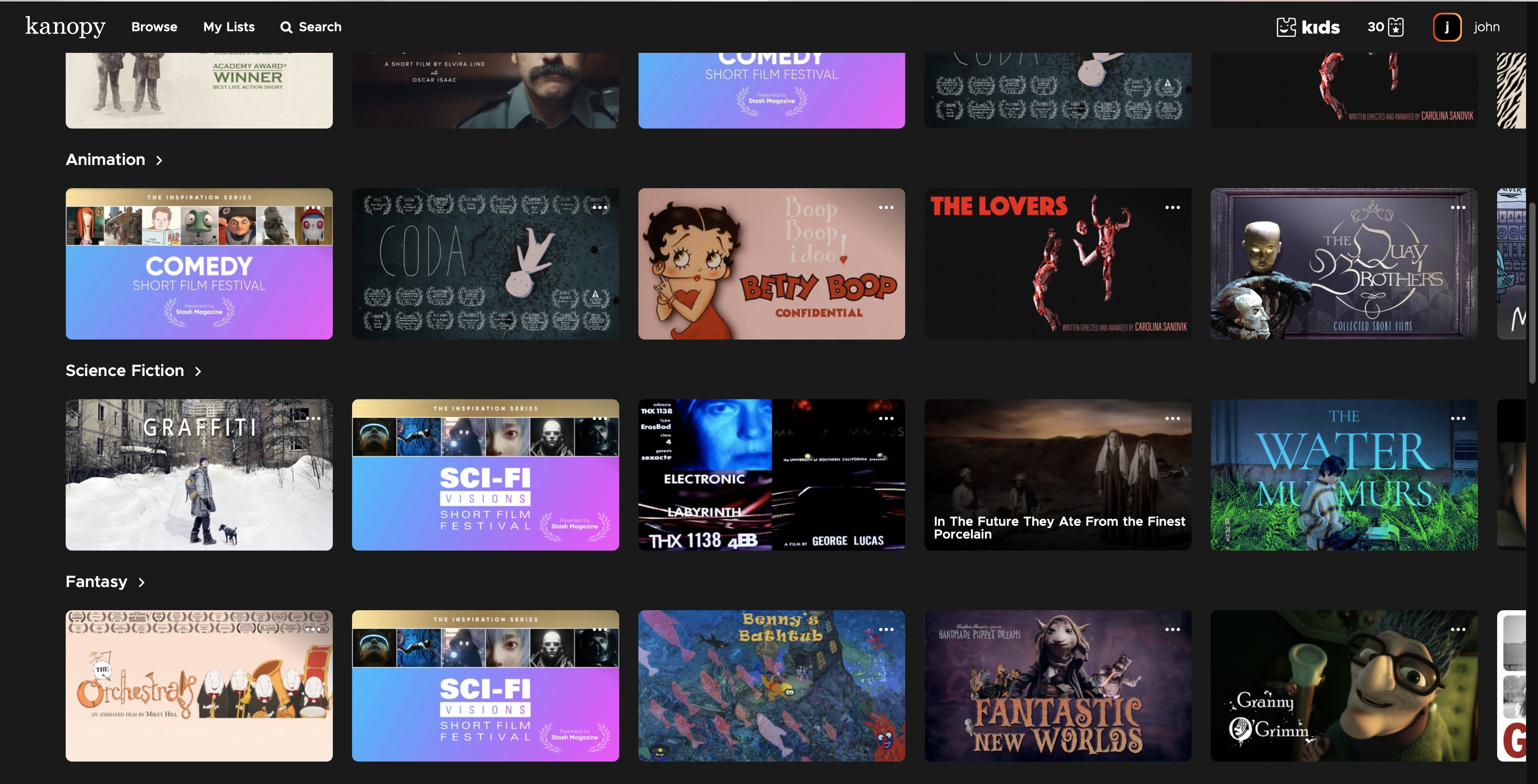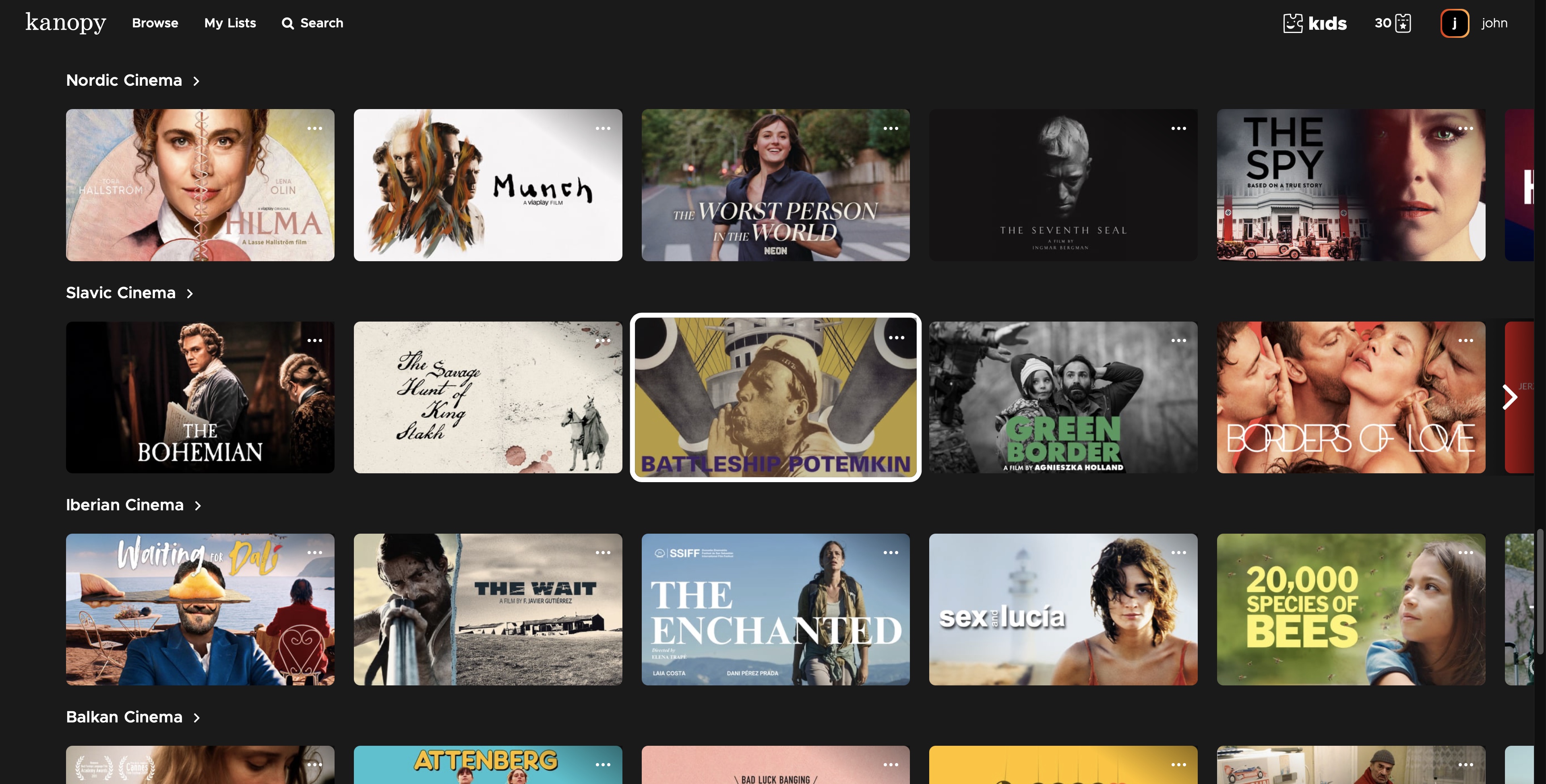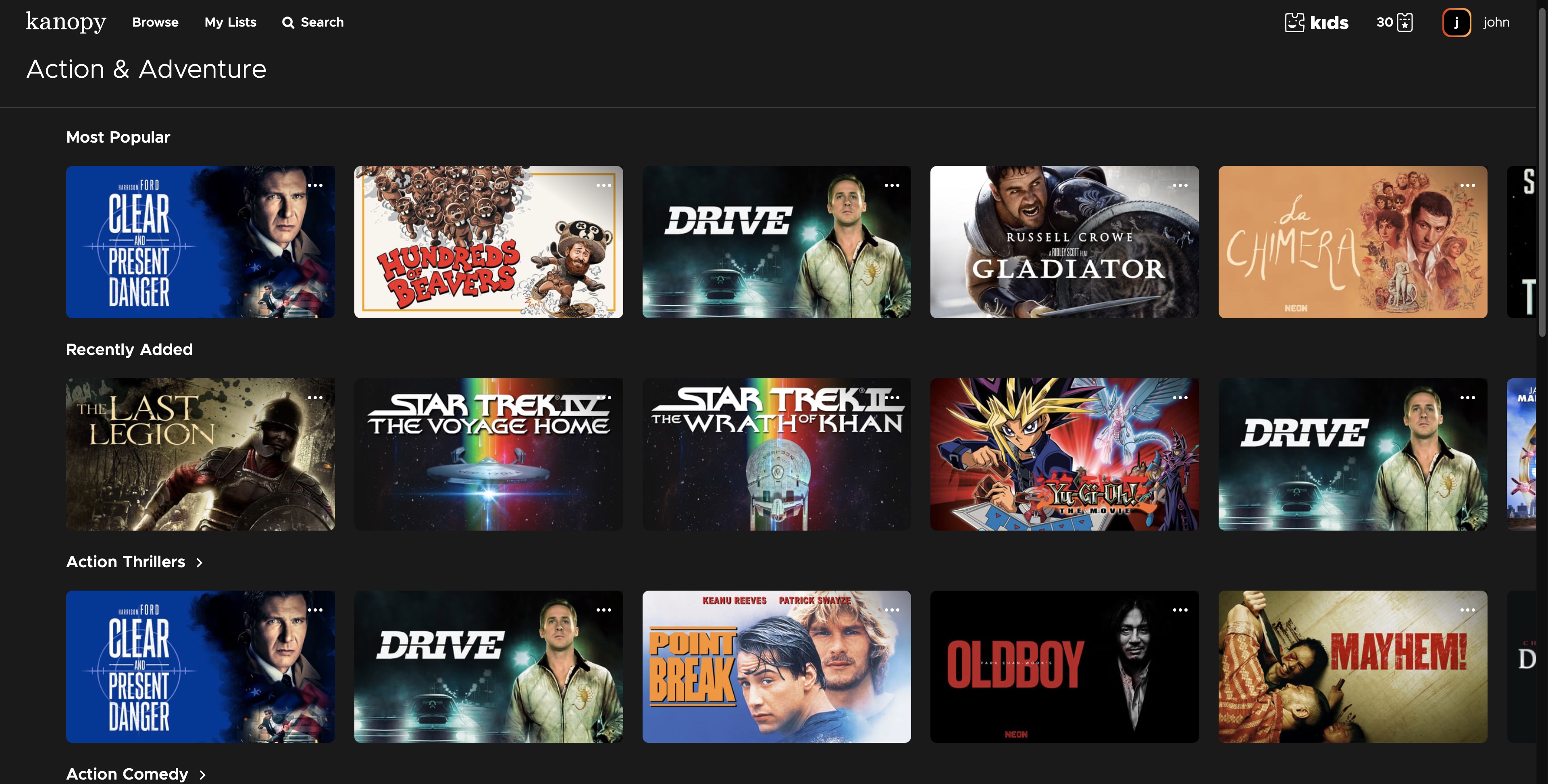 While Kanopy does not allow for a much in the way of customization, it does have several different ways of allowing the user to navigate their offerings.