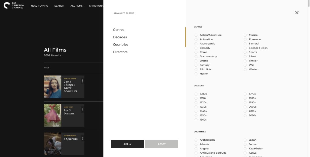 I’ve never seen the option on other sites to look at Iberian or Balkan cinema before. I find this to be a wonderful way to find new and interesting things to watch, something that has become increasingly difficult with most streaming services.